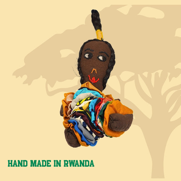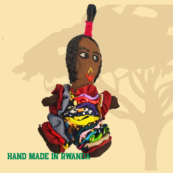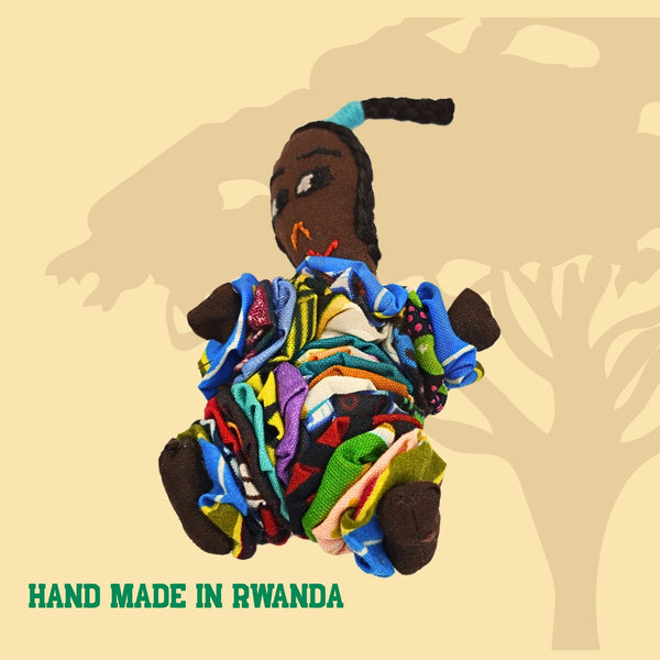 Bambolina di pezza con abiti africani in cotone Wax, di fantasie e colori vari, realizzati artigianalmente in Ruanda.