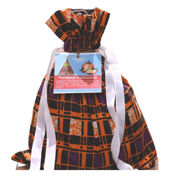 Un morbido e profumatissimo panettone classico con uvetta e candiditi confezionato in una coloratissima sacca Wax cucita a mano da donne in difficoltà.